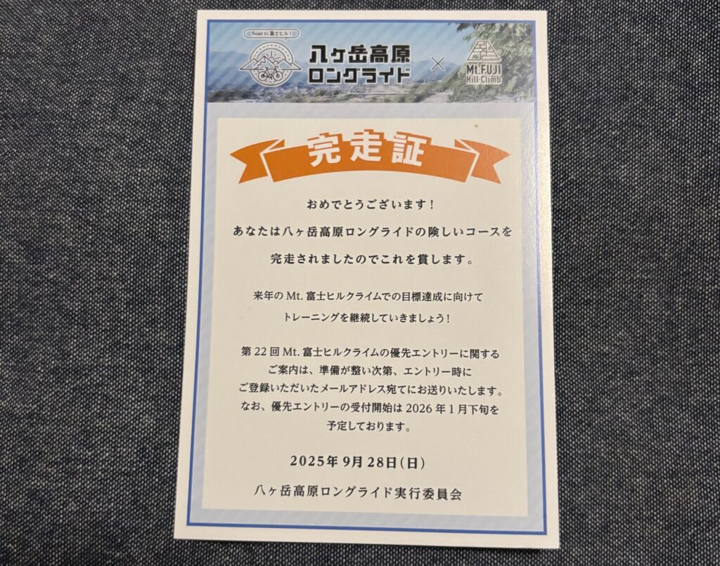 八ケ岳高原ロングライドは2025年より、富士ヒルクライムの公式イベントとしてリニューアルされました。これにより、当イベントへ参加することで、翌年の富士ヒルクライムの出走権を得ることができるようになっています(‘ω’)ノ 確定で富士ヒルクライムに出られるのはすごいですね!